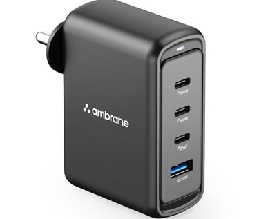 Buy Now Ambrane 100W GaN Charger: Fast Charging Adapter with 4 Ports (3 USB-C + 1 USB-A), PD Support, iPhone 0–50% in Minutes, Compatible with All iPhones